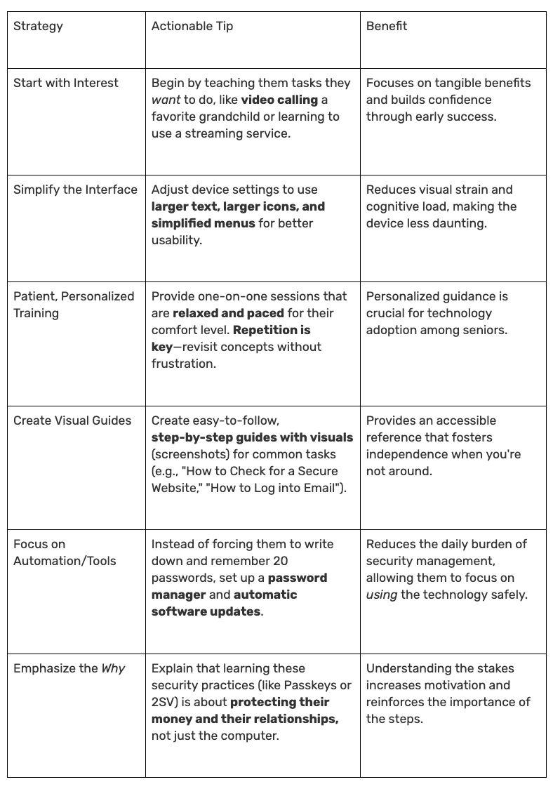 Passkeys are gradually being adopted by more websites and services (Google, Apple, Microsoft, Amazon, and PayPal are among them). Helping your senior family members transition to Passkeys wherever available is a significant step towards ultimate online protection.