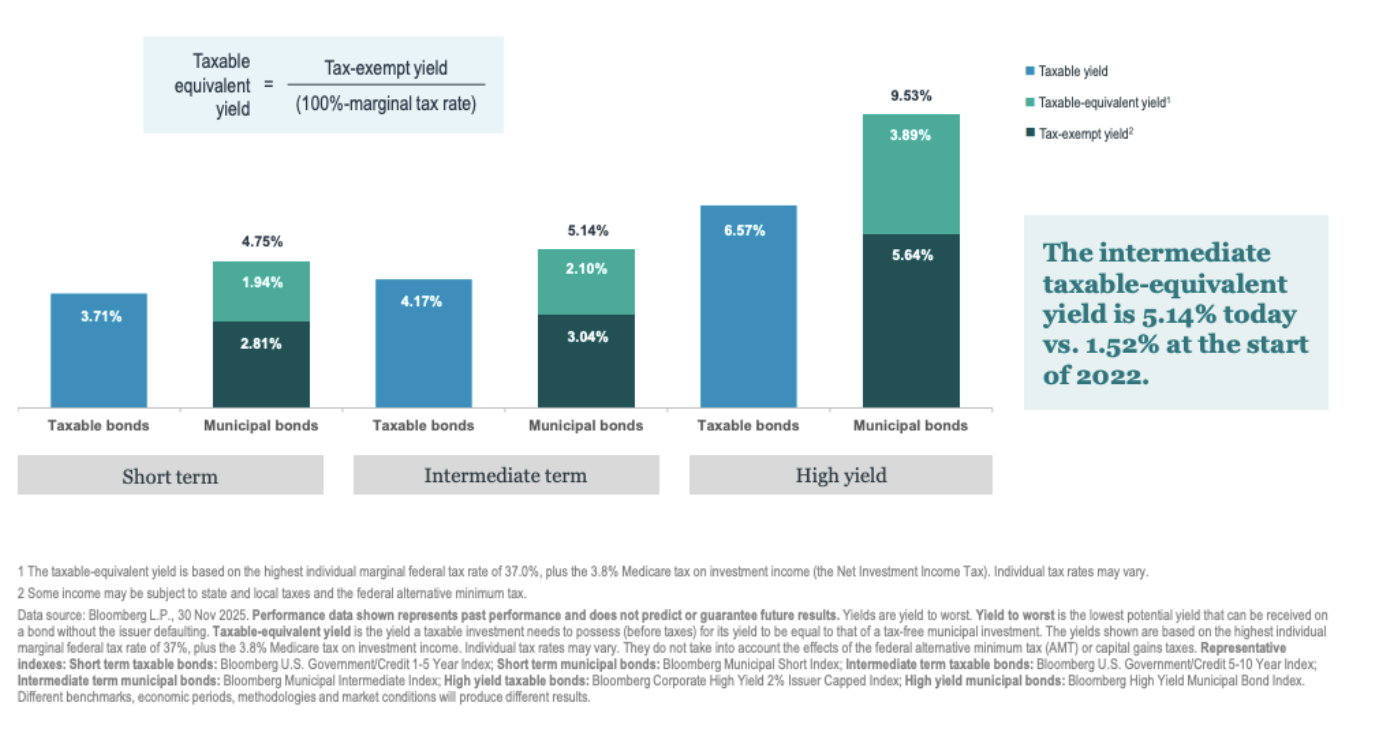 The chart below, from Nuveen, highlights the tax-equivalent yields available in municipal bonds relative to taxable alternatives for high-income investors.